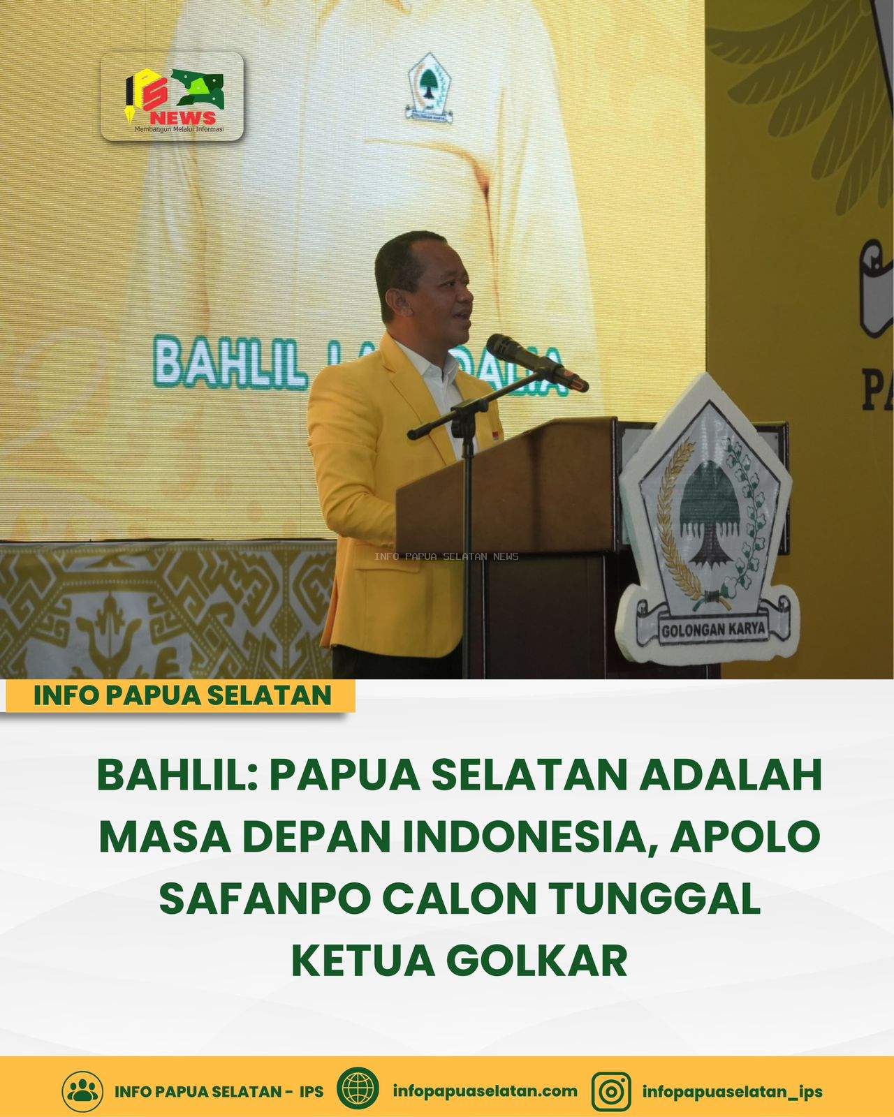 “Saya diberi tahu panitia bahwa hanya ada satu calon ketua DPD Golkar Papua Selatan, yakni Apolo Safanpo. Kita semua harus dukung,” ujar Bahlil di hadapan peserta Musda.