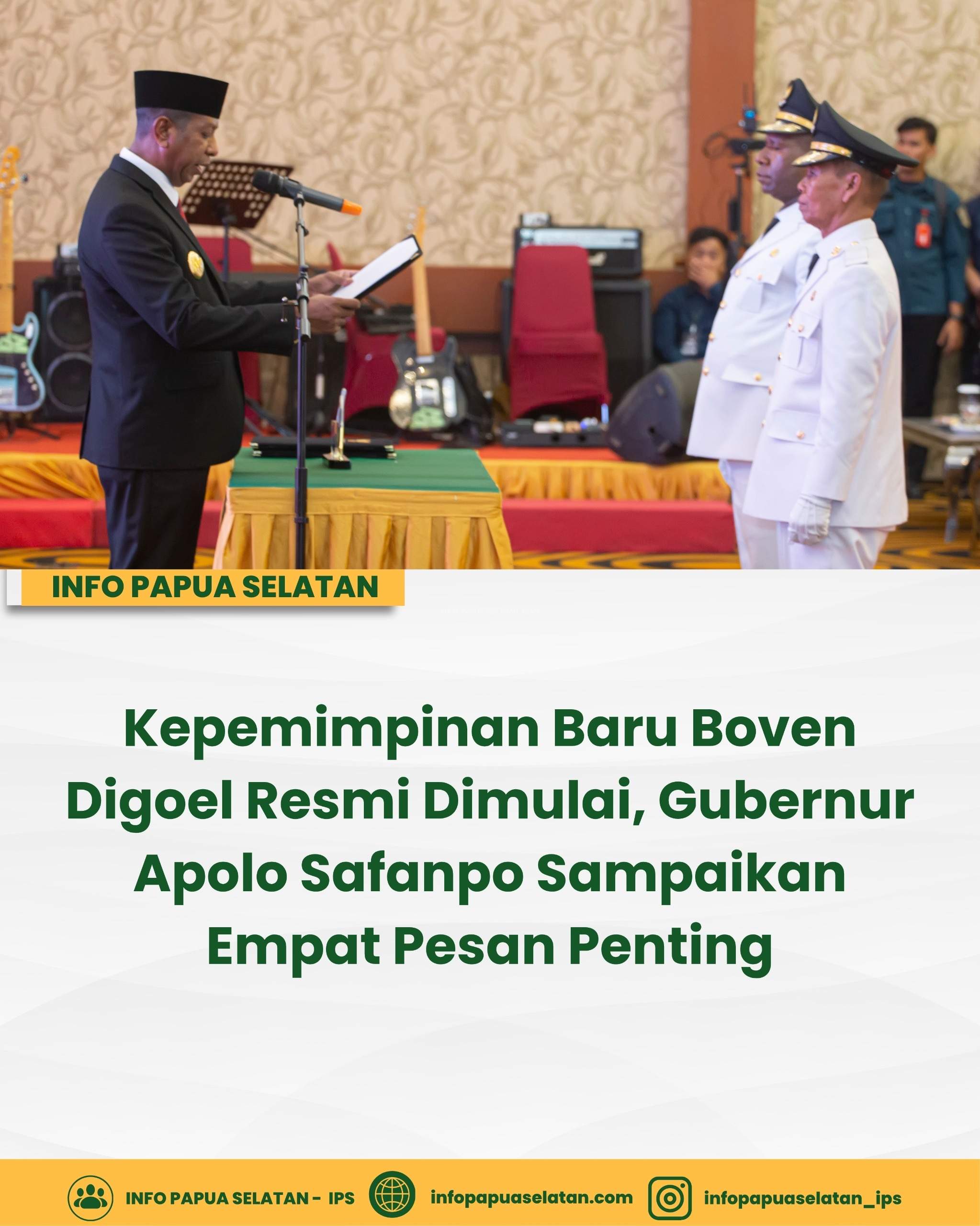 “Atas nama pemerintah dan seluruh masyarakat Provinsi Papua Selatan, saya mengucapkan selamat dan sukses kepada Saudara Bupati dan Wakil Bupati Boven Digoel yang baru saja dilantik. Ini adalah amanah dan kepercayaan dari Tuhan, dari leluhur, dan dari masyarakat,” ujar Gubernur Apolo dalam sambutannya.
